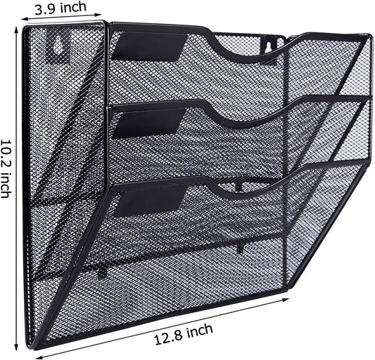 3 Pocket Mesh Hanging Wall File Organizer, Wall Mounted Mail Paper Document Folder Holder, Clipboard Storage Organization Magazine Rack with Nametag Label for Office Home School, Black